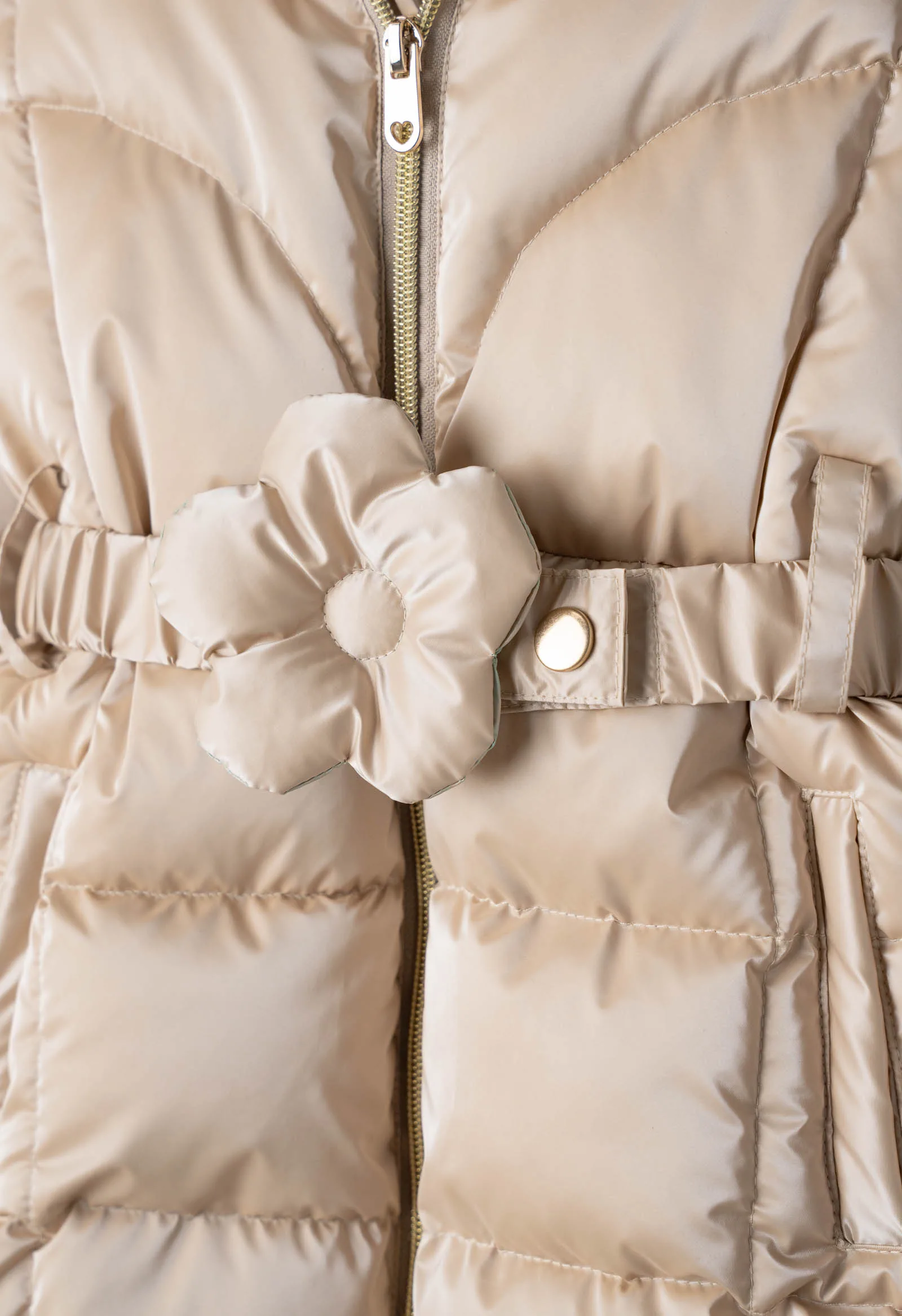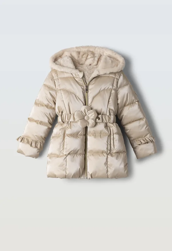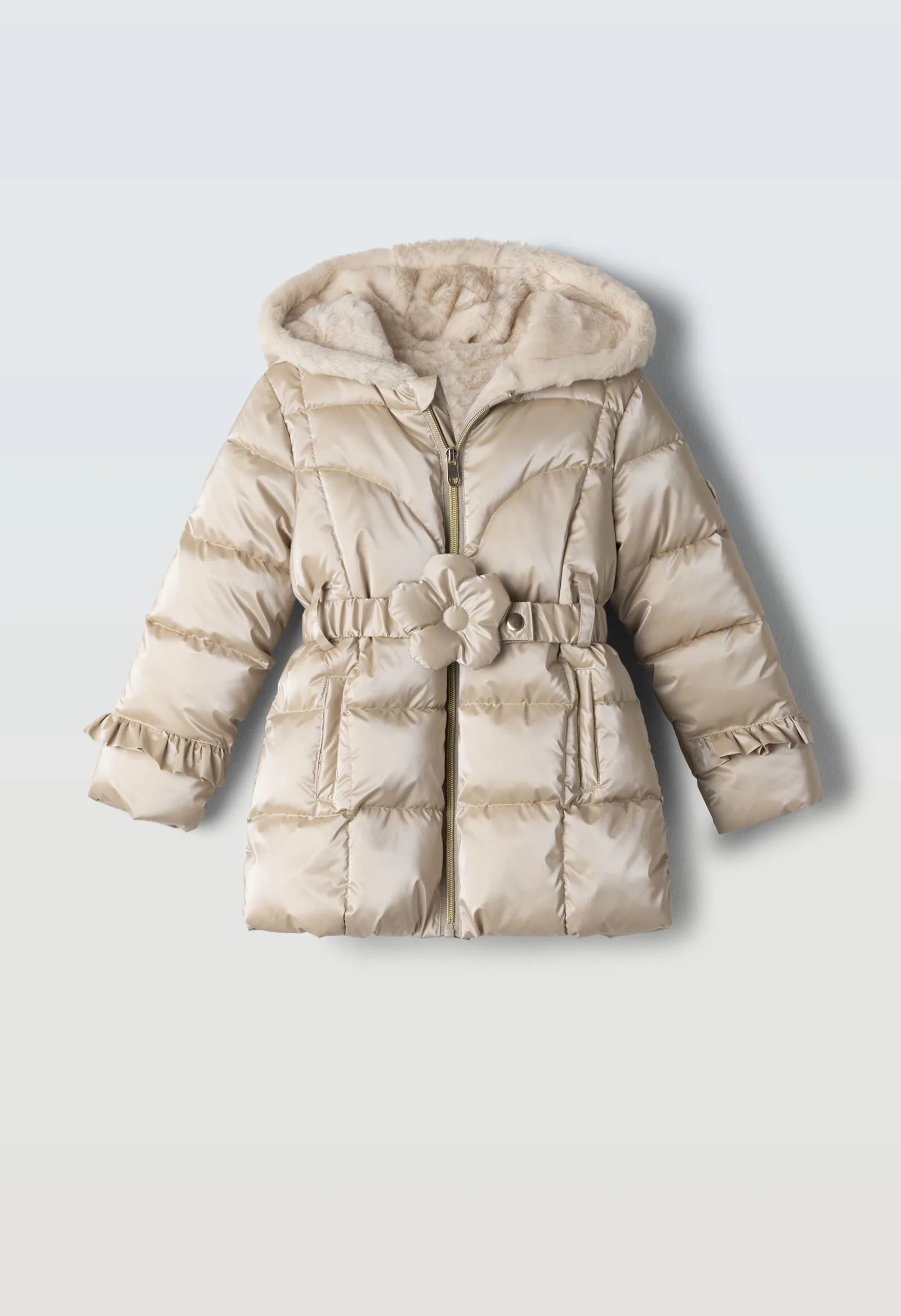 Μπουφάν σε απαλή χρυσή απόχρωση και εσωτερική επένδυση από χνουδωτό ύφασμα. Διαθέτει ζωνάκι με διακοσμητικό λουλούδι.